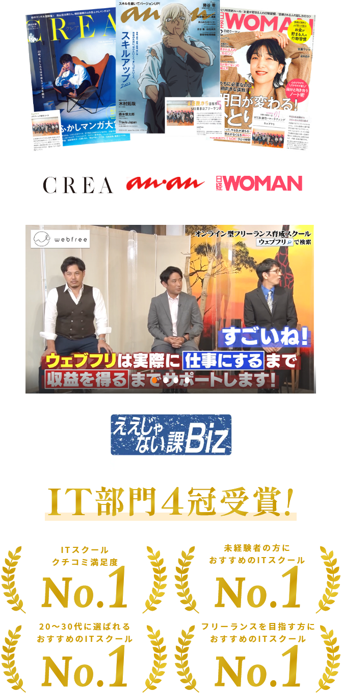 回答者数:①ITスクール 口コミ満足度 No.1(回答者数:1082) ②未経験の方におすすめのITスクール No.1(回答者数:1099) ③フリーランスを目指している方におすすめのITスクール No.1(回答者数:1100) ④20代~30代に選ばれているITスクール No.1(回答者数:481) 実施対象:①~③全国の男女、④全国の20代・30代の男女