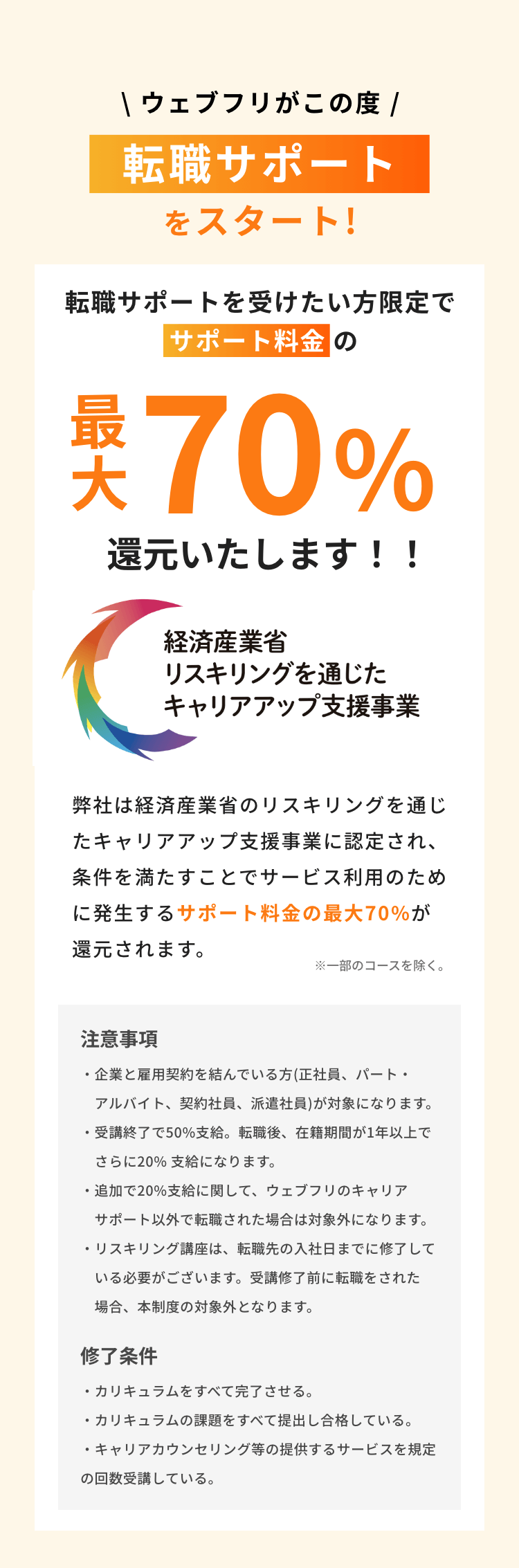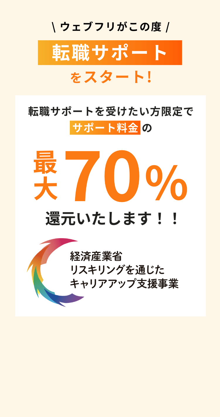 ウェブフリでは、未経験からWebを学んで実際に収入を得るまで受講生をサポートしています。卒業後も独立して自分で稼いでいける力がつく、カリキュラムを提供いたします。現役フリーランスのコーチが初回面談から案件獲得~納品までお手伝いするので誰でも挫折せずに副業の成功や、Web業界への転職など理想の働き方を目指せます。